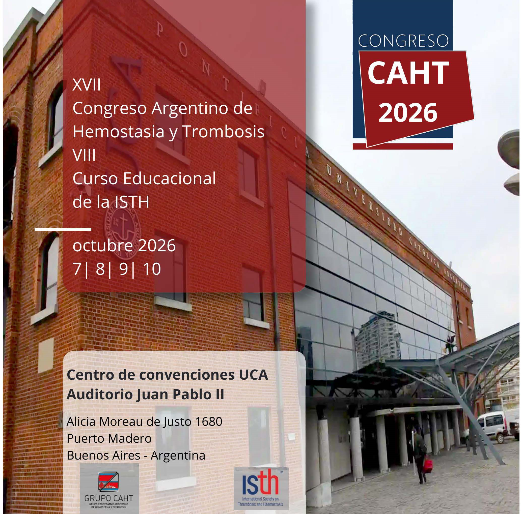 Es un placer para nosotros comunicarles que el Grupo Cooperativo Argentino de Hemostasia y Trombosis (Grupo CAHT) está organizando con gran entusiasmo el XVII Congreso Argentino de Hemostasia y Trombosis y el VIII Curso Educacional de la Sociedad Internacional de Hemostasia y Trombosis.